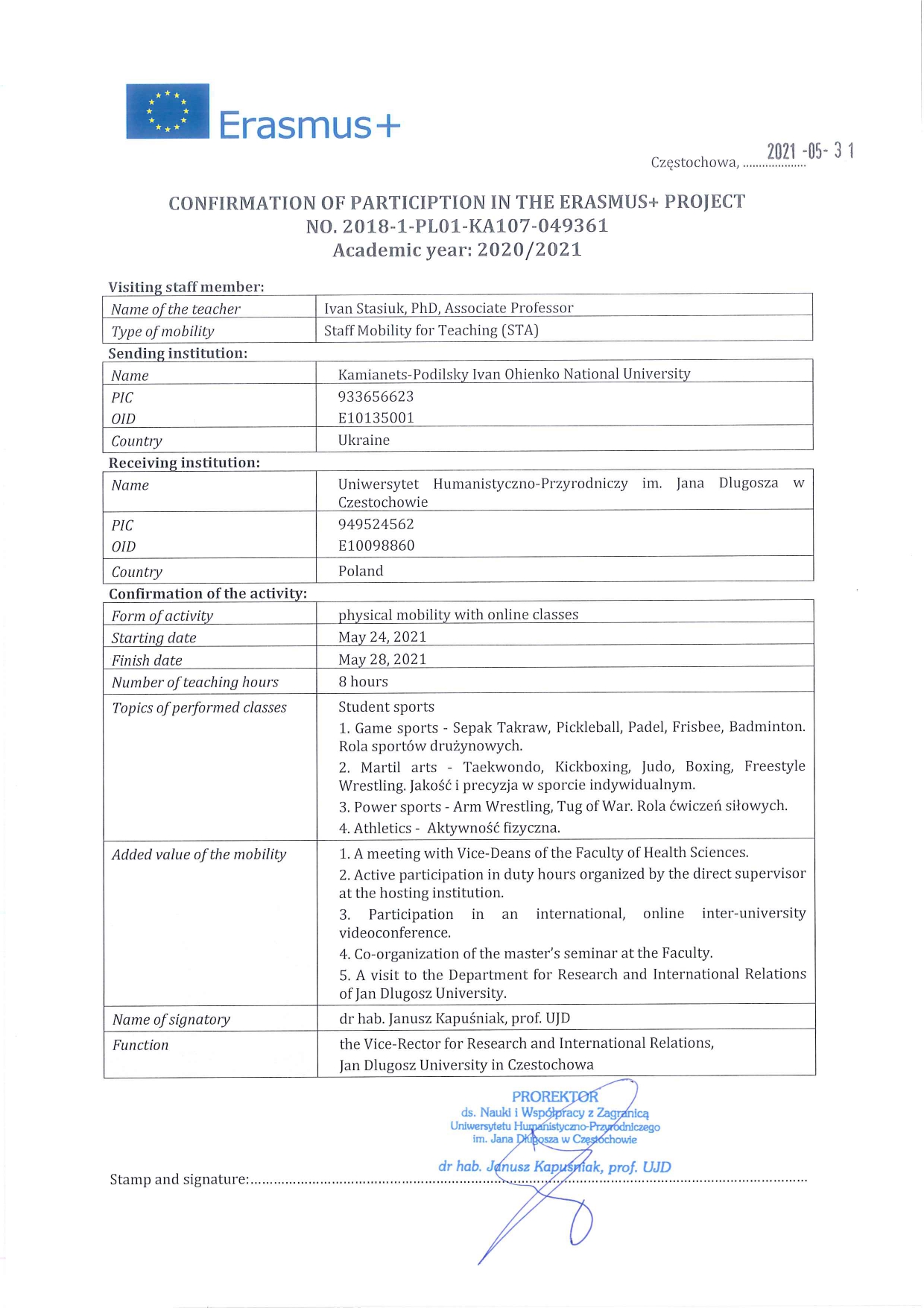 Із 24 до 28 травня 2021 року декан факультету фізичної культури доцент Іван Стасюк взяв участь у програмі академічної мобільності Erasmus+ KA1:Staff Mobility For Teaching в Гуманітарно-природничому університеті імені Яна Длугоша в Ченстохові (Республіка Польща).