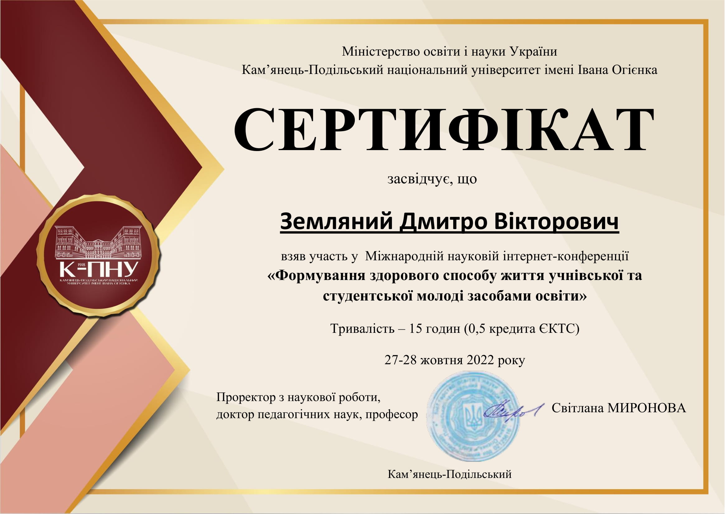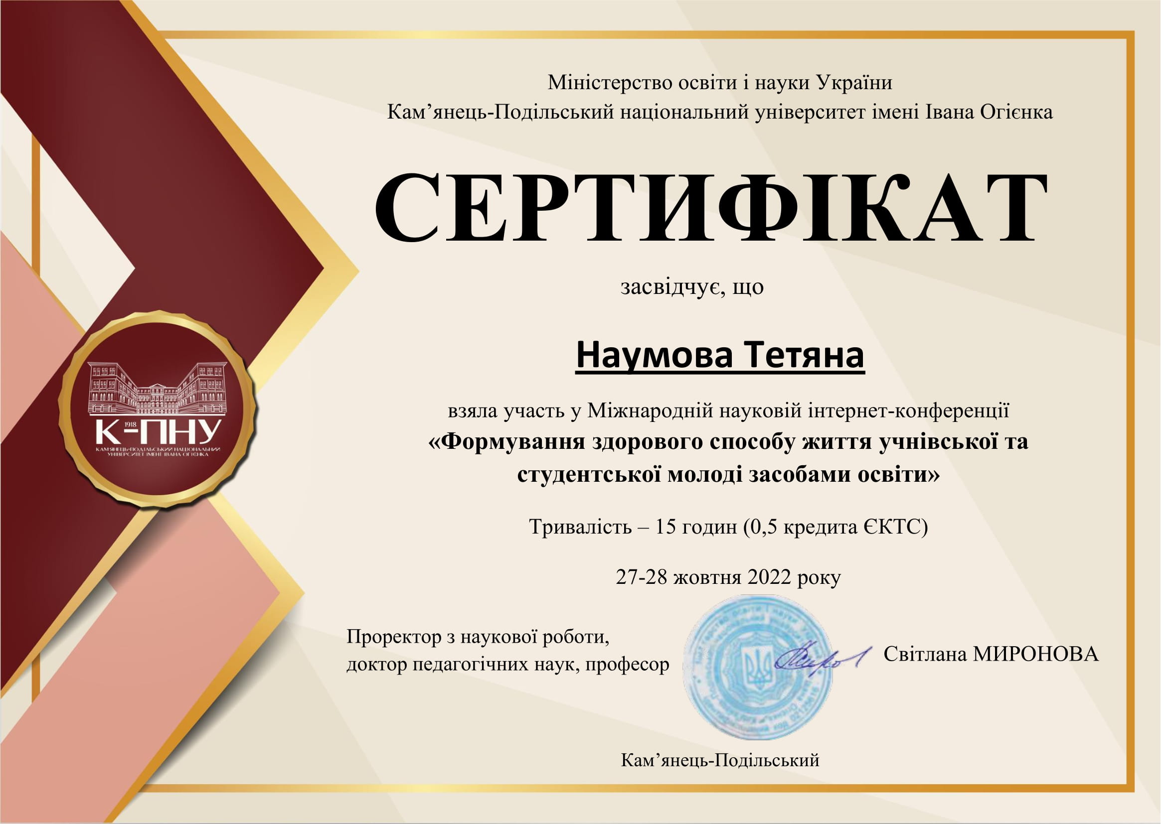 Міжнародна наукова інтернет-конференція «Формування здорового способу життя учнівської та студентської молоді засобами освіти», 27-28 жовтня 2022 рік